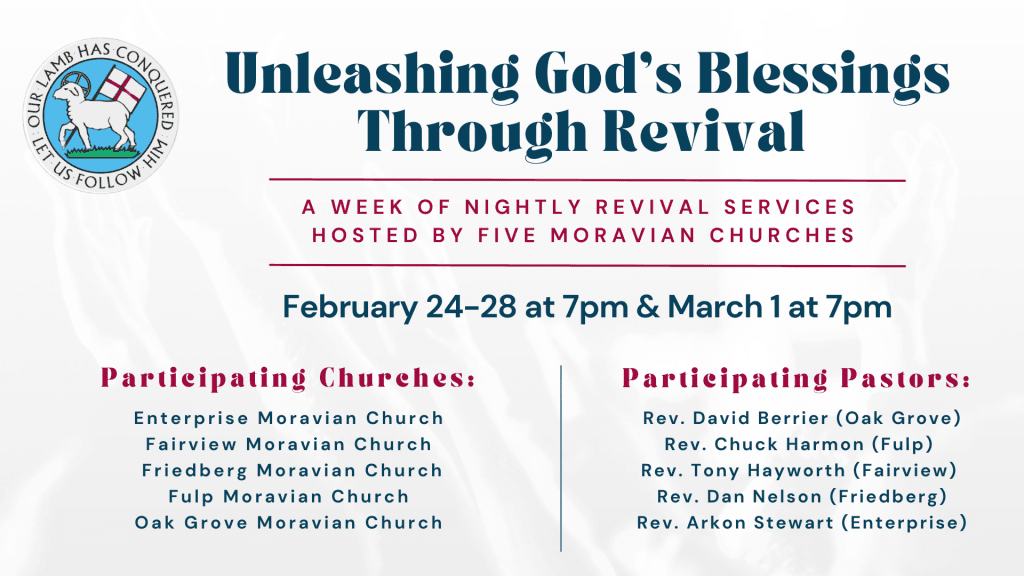 The week will culminate in a special combined service with a combined choir on Saturday, March 1, 2025, at Fairview Moravian Church at 7pm. This date holds special significance as it marks the birthday of the Moravian Church, founded on March 1, 1457 – a perfect time for renewal and revival!