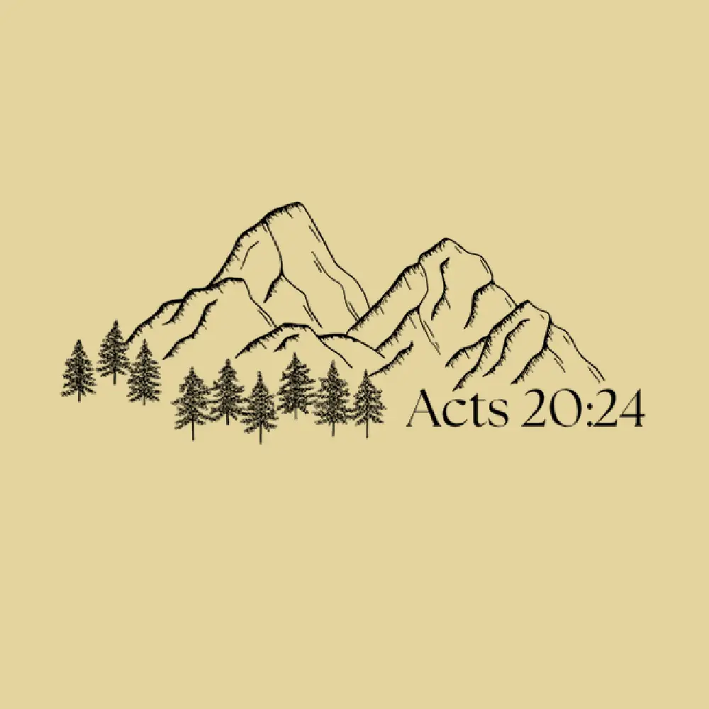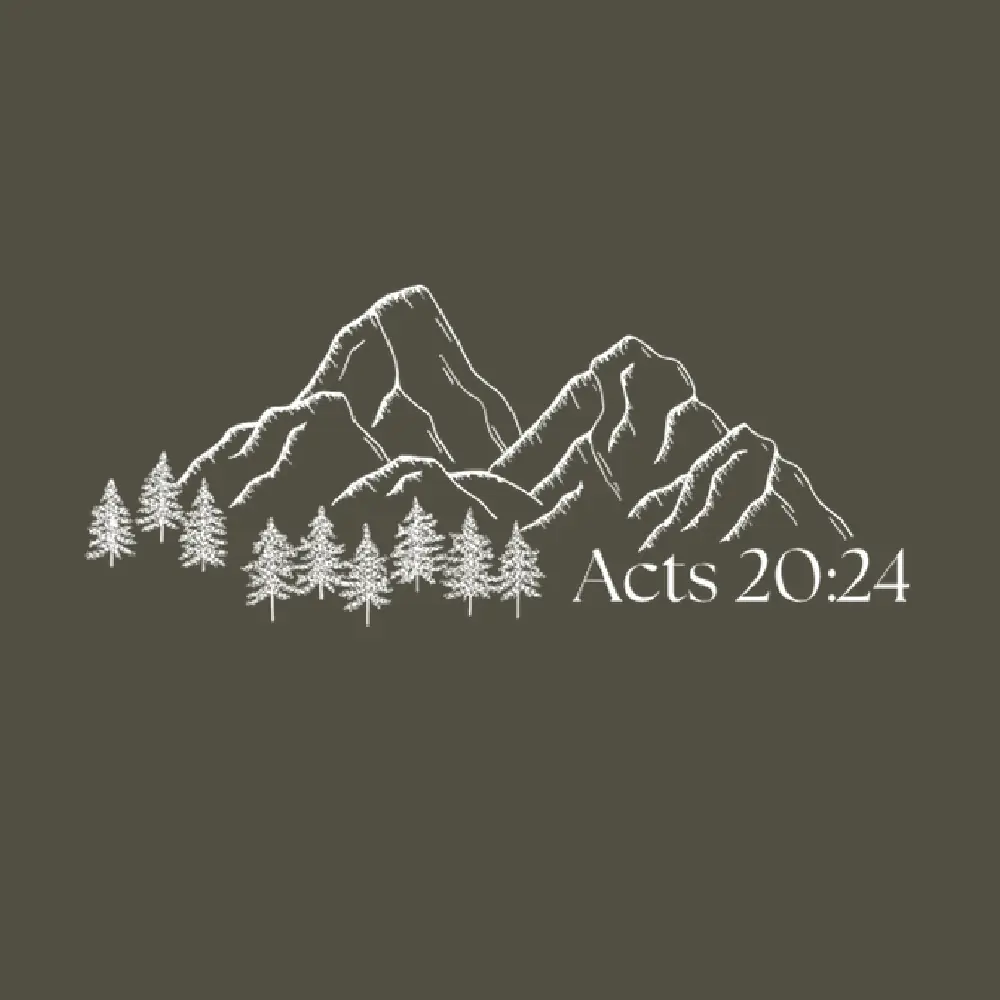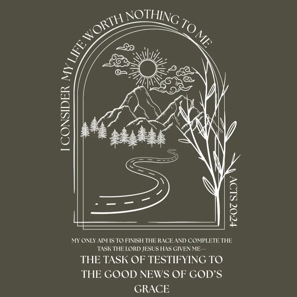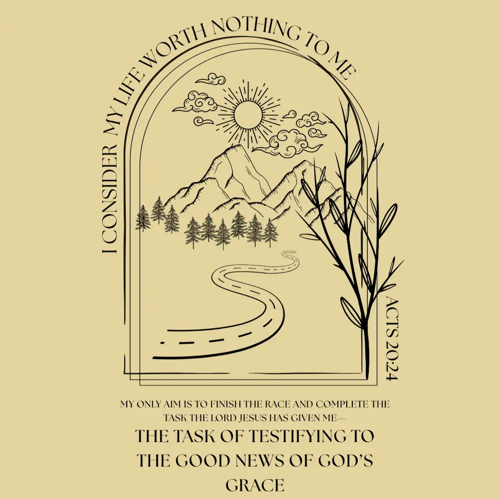Unisex t-shirt in your choice of three colors. Features beautiful artwork on the front and back referencing Acts 20:24 NIV: “However, I consider my life worth nothing to me; my only aim is to finish the race and complete the task the Lord Jesus has given me—the task of testifying to the good news of God’s grace.”